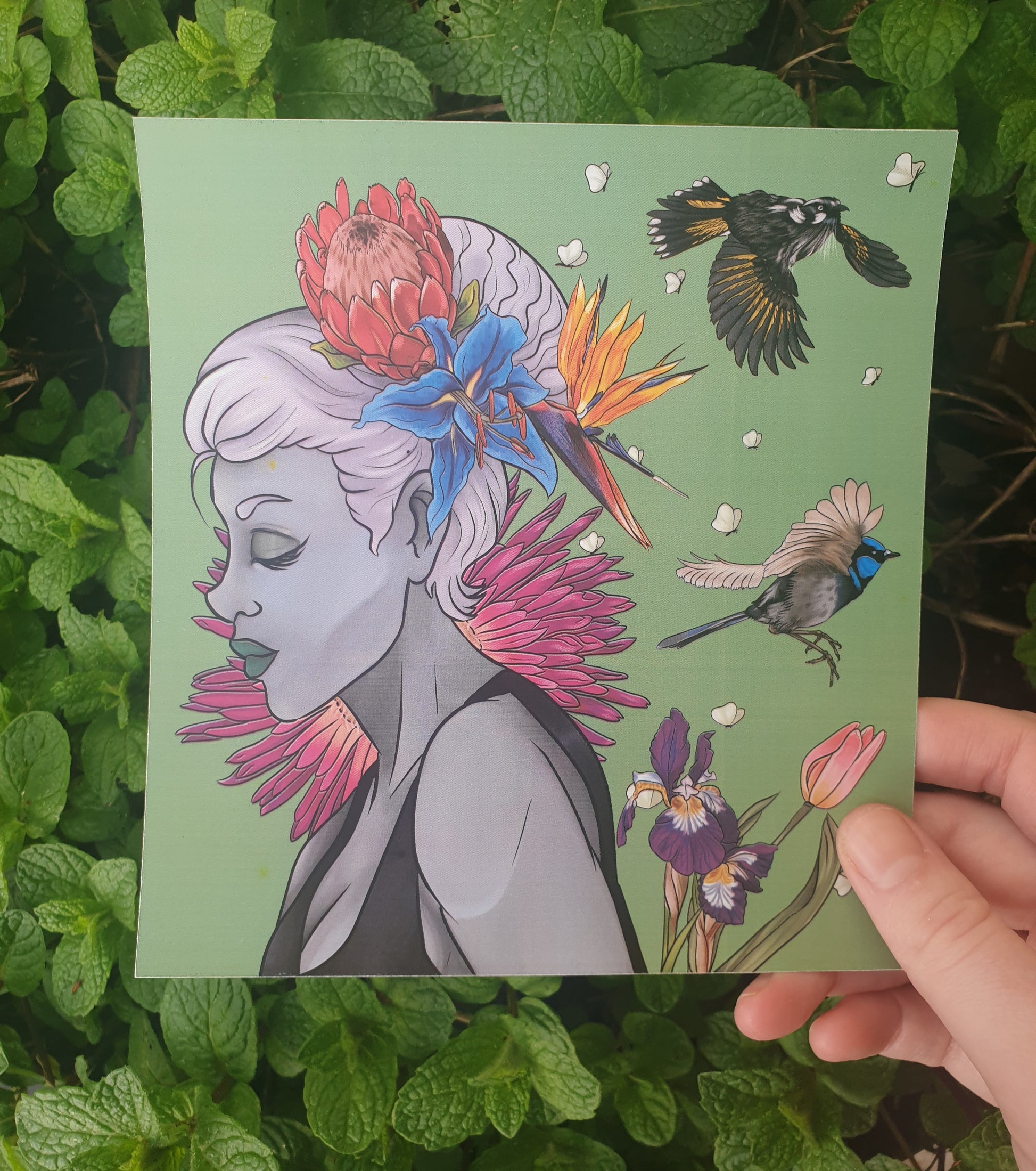 This botanical art print features a woman in grey scale surrounded by vibrant birds and flowers. The flowers are a protea, blue lily, pigface, iris and tulip. The birds are a splendid fairy wren and a New Holland honeyeater.